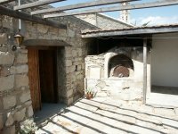 An arched gate leads through a high stone wall into a large, sunny, private courtyard (total area 400 sq. m.). There is ample parking space just outside. The courtyard is partly paved, partly established garden with trees, flowers, vine pergola and a fine example of a traditional oven.