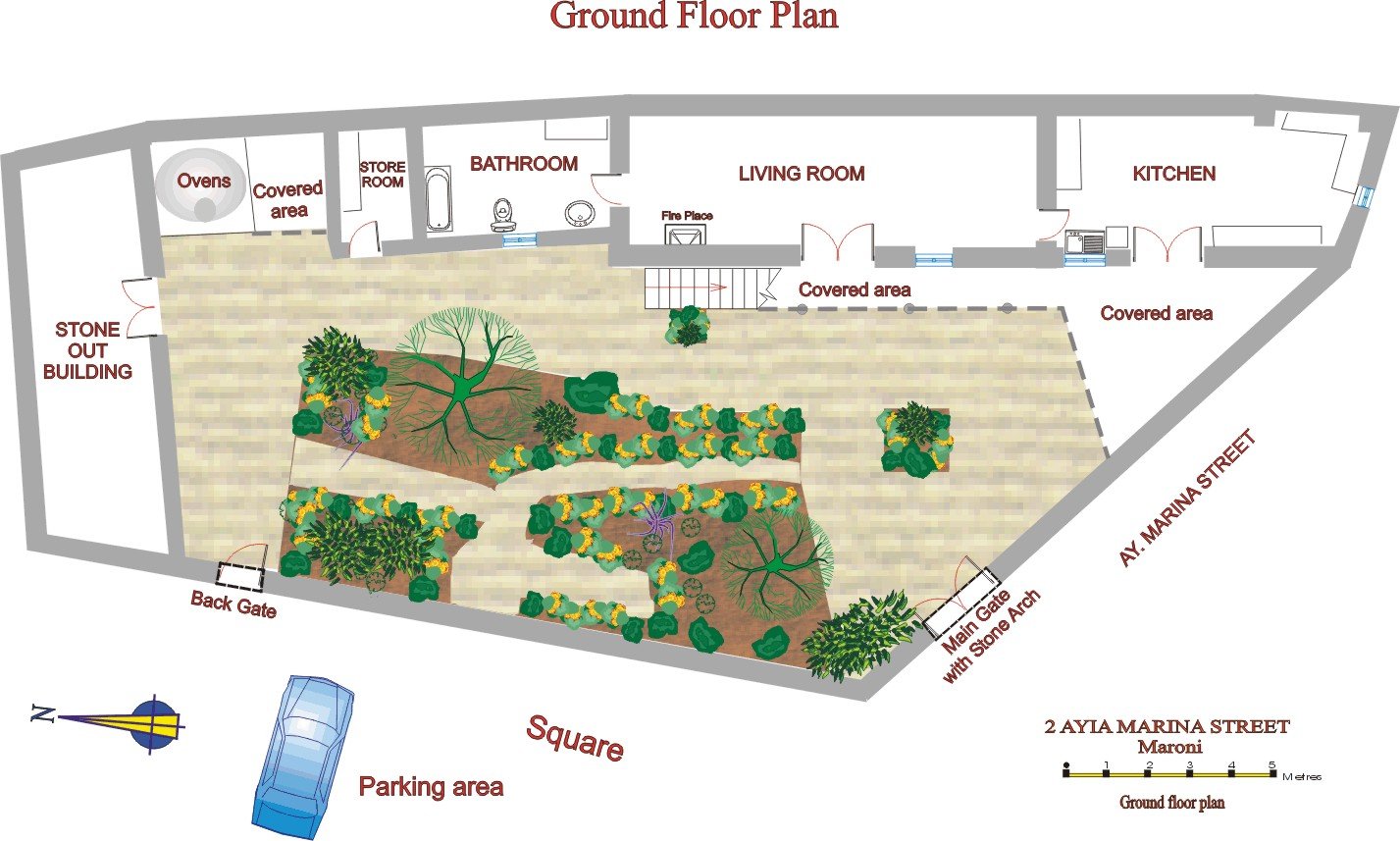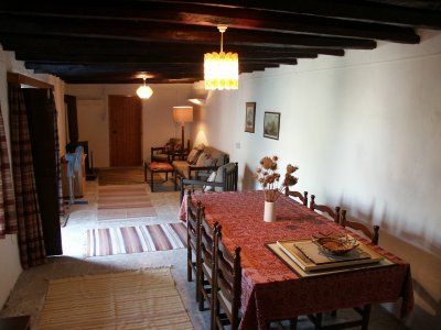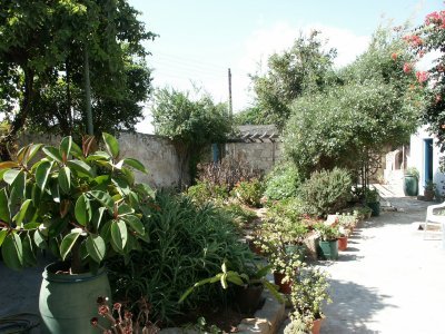 An arched gate leads through a high stone wall into a large, sunny, private courtyard (total area 400 sq. m.). There is ample parking space just outside. The courtyard is partly paved, partly established garden with trees, flowers, vine pergola and a fine example of a traditional oven.