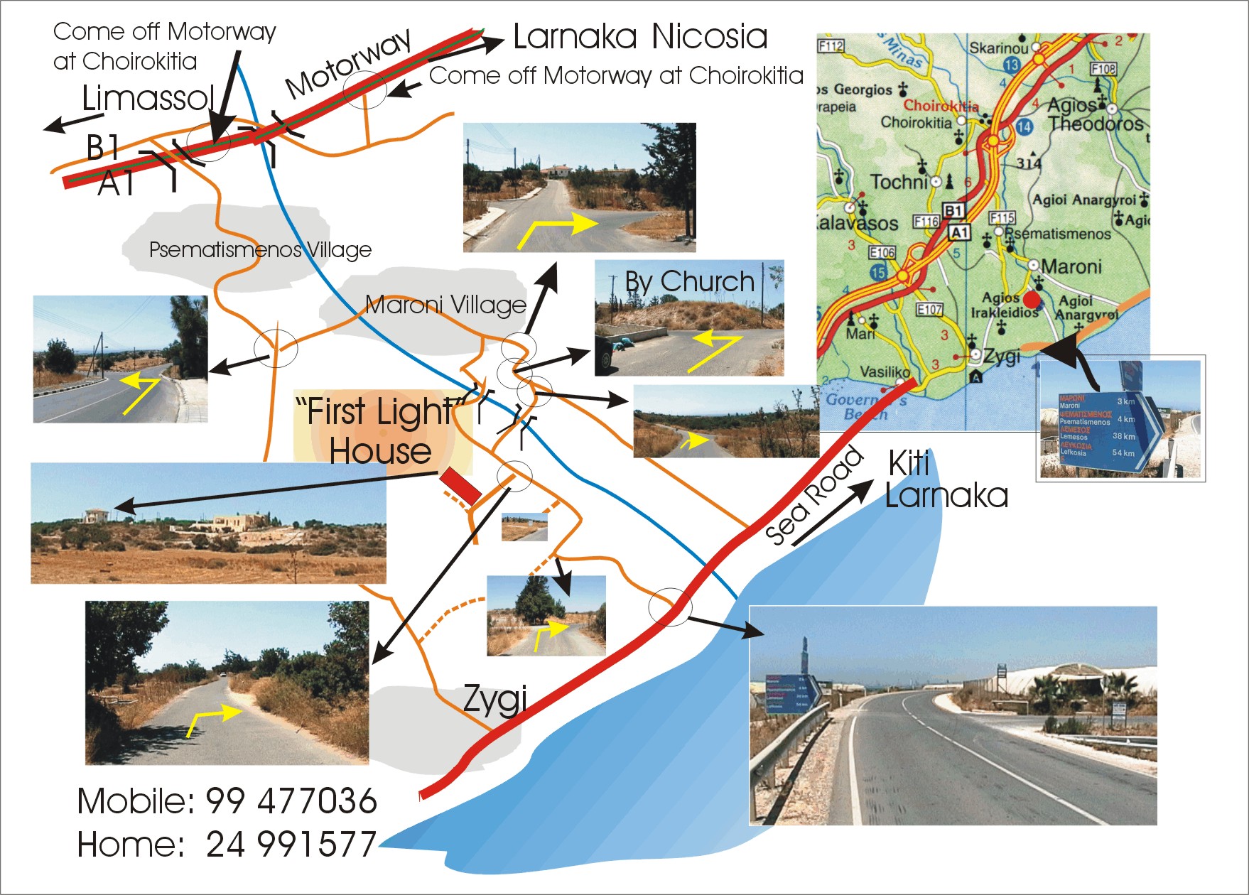 From Nicosia Take the main dual carriage highway A1 to Limassol / Larnaca, turn off on the left at Choirokitia, this is sign posted to Maroni, turn right at the "T" junction, go under the motorway bridge, turn right at the "T" junction follow this road "B1" that runs parallel with the dual carriage highway about 2Km, take the next left sign post to Maroni over the dual carriage highway, follow this road through the village of Psematismenos, as you leave the village you will need to turn left at the sign post to Maroni, head towards the sea and use the map above. |