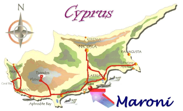 From Limassol. Take the main dual carriage highway A1 to Larnaca / Nicosia, turn off on the right at Choirokitia, this is sign posted to Maroni, turn left at the "T" junction, follow this road "B1" that runs parallel with the dual carriage highway about 2Km, take the next left sign post to Maroni over the dual carriage highway, follow this road through the village of Psematismenos, as you leave the village you will need to turn left at the sign post to Maroni, head towards the sea and use the map above. |