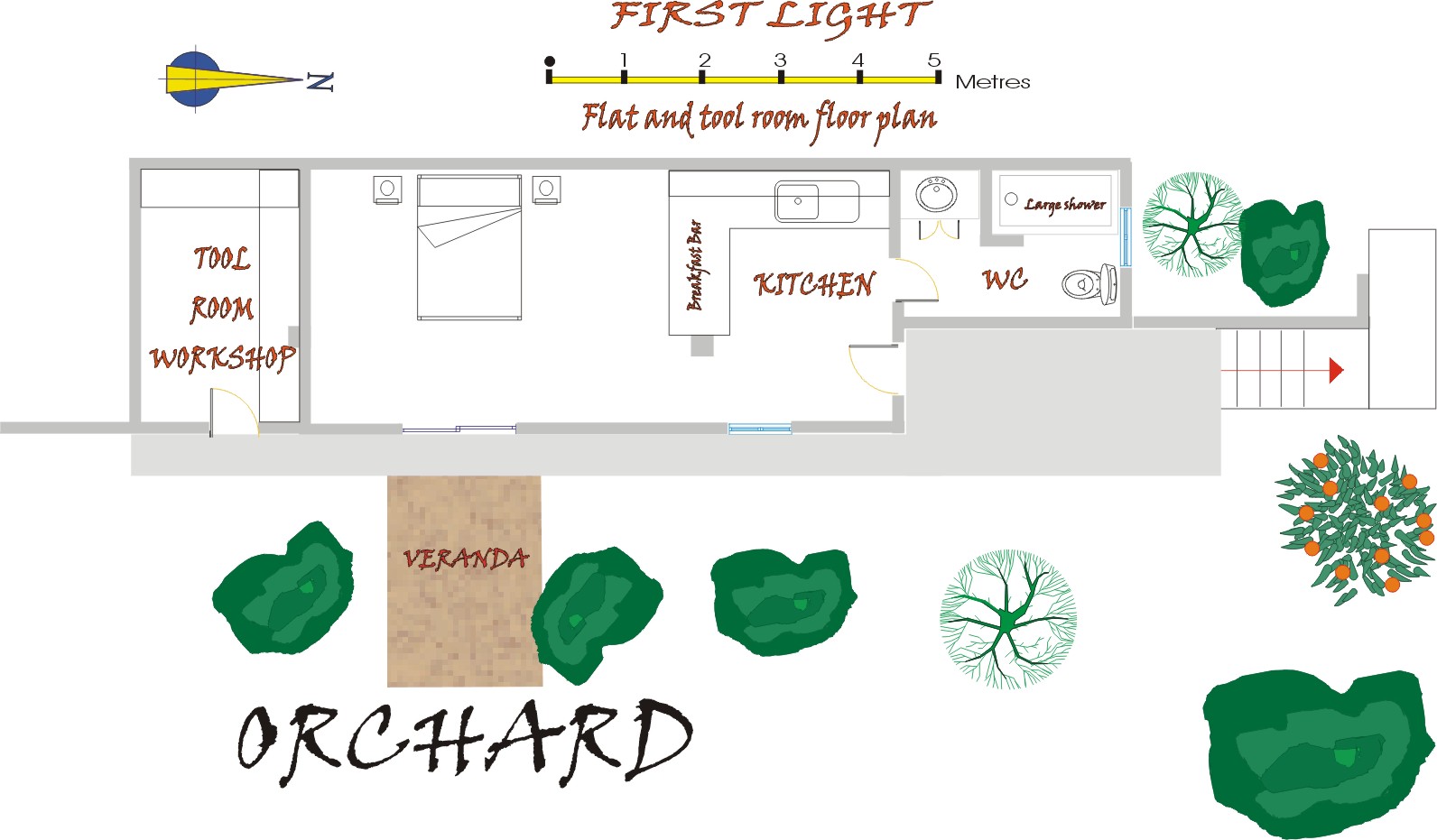 This has a set of double glazed tinted glass patio doors direct to the orchard with small seating area. On the left of this is the tool room/workshop which could easily be converted into additional bedroom. |