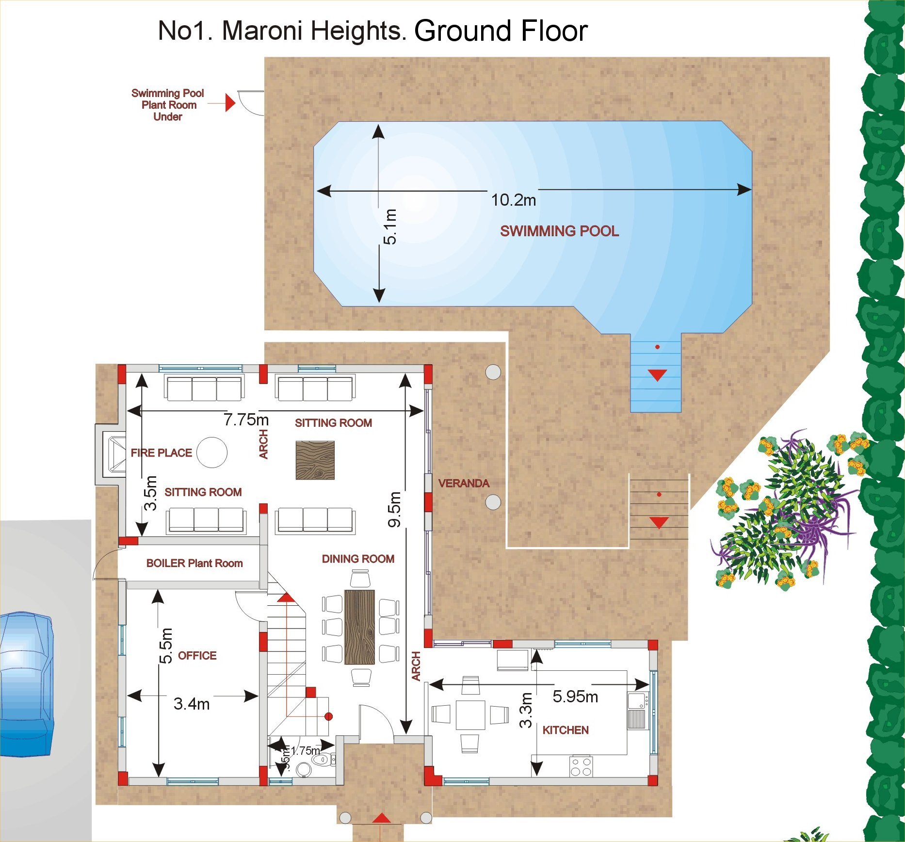 The land size of the plot is approximately 1200 square metres. The outside of the property has tiled walkways, a large tiled veranda with tiled steps leading to the swimming pool area which also has a fully tiled surround. The boiler room has access from the parking area outside the property. The concrete parking area and driveway, entered through by double gates to left of the property. A pedestrian gate situated opposite the front door with a concrete walkway that leads to the front porch and main entrance door. |
