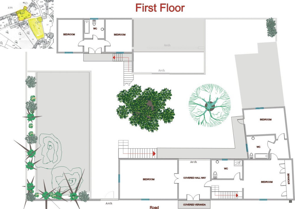 Entrance off the quiet road of St. Minas street through a stone arched doorway into an open fully walled courtyard with lawn on the left and gardens. Crazy paved stone path which leads to a central secluded area. There are doors from this area to the main house both through the dining room, library and study rooms, also to the self contained two story cottage. |